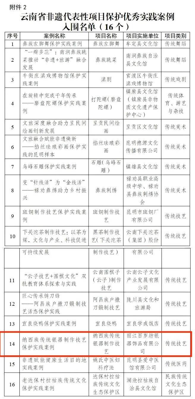 云南网讯(记者龙彦)近日鸿满仓,云南省非物质文化遗产保护中心发布2025年“云南省非遗代表性项目保护优秀实践案例”入围名单,其中,丽江百岁坊银器饰品有限公司推送的“纳西族传统银器制作技艺”成功入选。